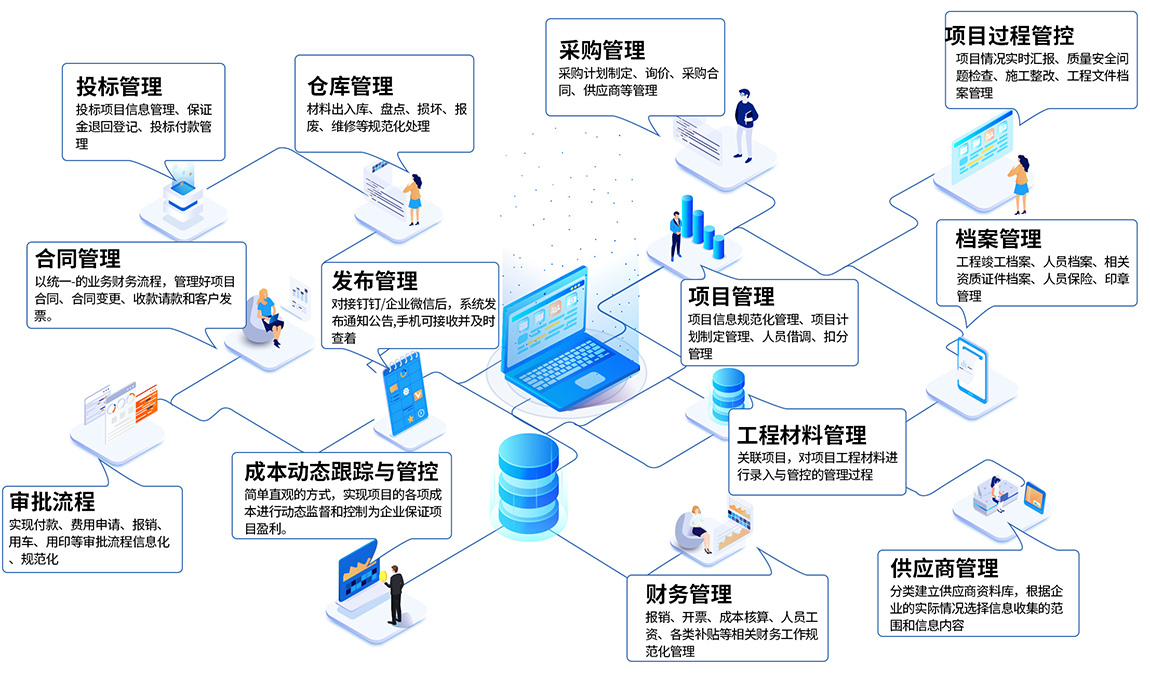 數(shù)字化管理系統(tǒng)對企業(yè)工程項目從項目投標(biāo)中標(biāo)、項目過程管理、合同管理、物資設(shè)備管理、采購管理、項目過程管理、施工隊管理、供應(yīng)商、成本核算等進(jìn)行全面綜合管理;縱向貫穿投標(biāo)、采購、施工、竣工的全過程,橫向涉及公司內(nèi)部的各相關(guān)崗位,是一套全方位、集成的企業(yè)項目綜合管理平臺。通過對成本、進(jìn)度、質(zhì)量、安全等方面的控制,以及對合同、結(jié)算、支付、資金等要素的管理,來提高工程類企業(yè)對工程項目的綜合配套能力。